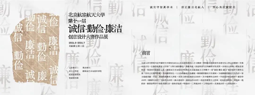 为深入学习贯彻习近平新时代中国特色社会主义思想和党的二十大精神,贯彻落实全国宣传思想文化工作会议精神,传承中华文化,弘扬传统美德,引导广大师生诚信勤俭、崇廉尚德,营造风清气正的校园文化氛围,由学生工作部、纪检监察机构、党委宣传部联合主办,博彩导航 承办的博彩导航 第十一届“诚信·勤俭·廉洁”创意设计大赛作品展在博彩导航 路校区新主楼二层和会议中心展出。