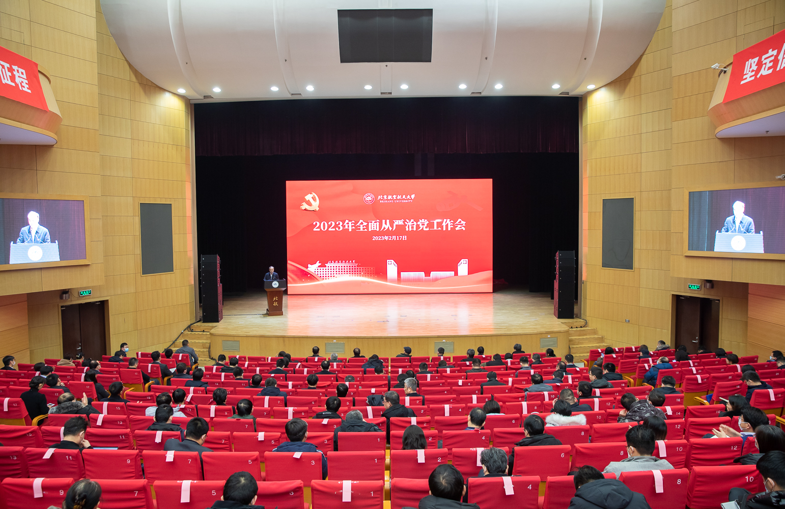 全面从严治党工作意义十分重大。要认真落实党中央和上级部署要求,把严的基调、严的措施、严的氛围长期坚持下去,一刻不停推进全面从严治党。一是牢牢把握全面贯彻落实党的二十大精神这条主线。要在全面学习、全面把握、全面落实上下更大功夫,引导广大干部师生坚定拥护“两个确立”、做到“两个维护”。二是不断完善党的领导的组织体系、制度体系、工作机制。要坚持和完善党委领导下的校长负责制,健全党委统一领导、党政分工合作、协调运行的工作机制,深化中央巡视整改,贯彻总体国家安全观,压紧压实意识形态工作责任,加强党对统战群团工作的全面领导。三是坚持不懈用习近平新时代中国特色社会主义思想凝心铸魂。要完善校、院、师生三级理论学习体系,健全用党的创新理论武装头脑、教育师生的长效工作机制。要进一步完善“大思政”工作格局,讲好疫情防控“大思政课”,加强学生心理健康教育。要把师德师风建设作为教师队伍建设的第一要务,建设高素质教师队伍。要传承红色基因,弘扬以“空天报国”为内核的博彩导航