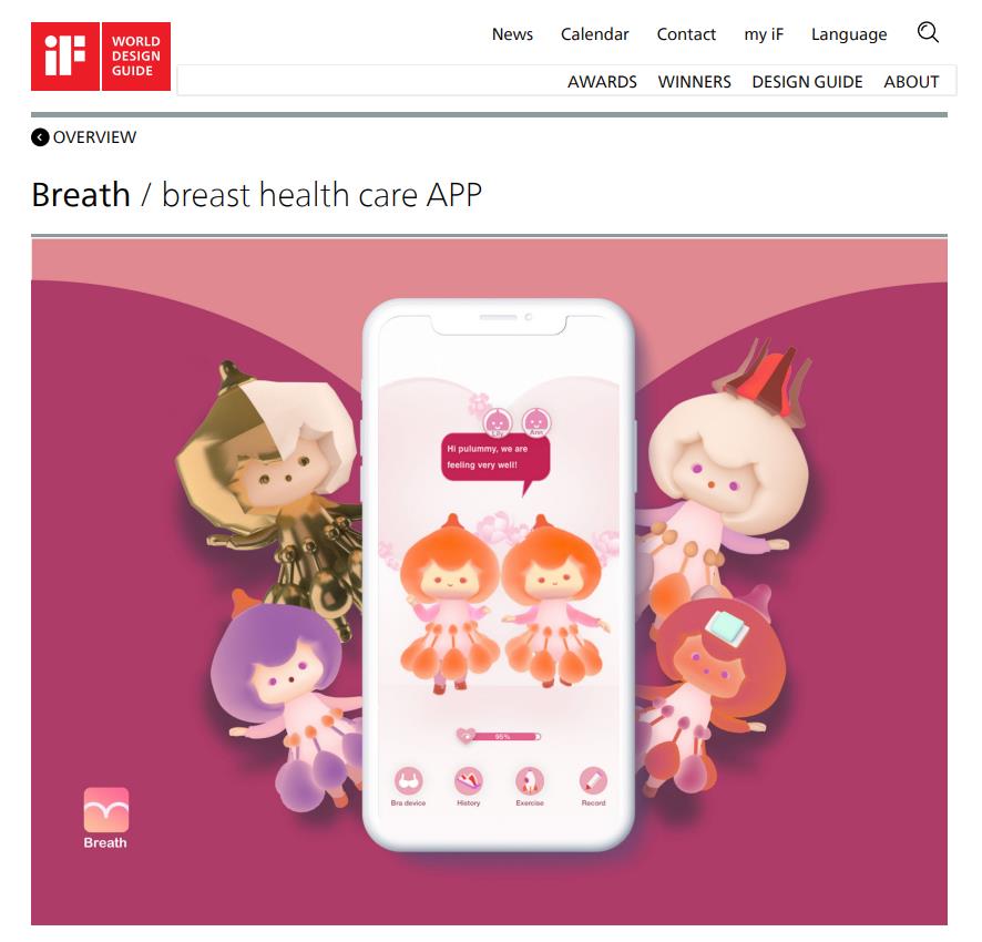 设计作品“Breath”是一款为乳房有问题的用户提供文胸设备的应用程序。乳腺疾病是常见的长期问题。但这些和自检很容易被忽视。文胸设备检测到的乳房健康数据被个性化为两个小仙子。这些仙子的变化是基于用户的健康数据,灵感来自乳房的结构和每个症状的出现。她们提供健康计划,做长期记录,和用户一起锻炼。