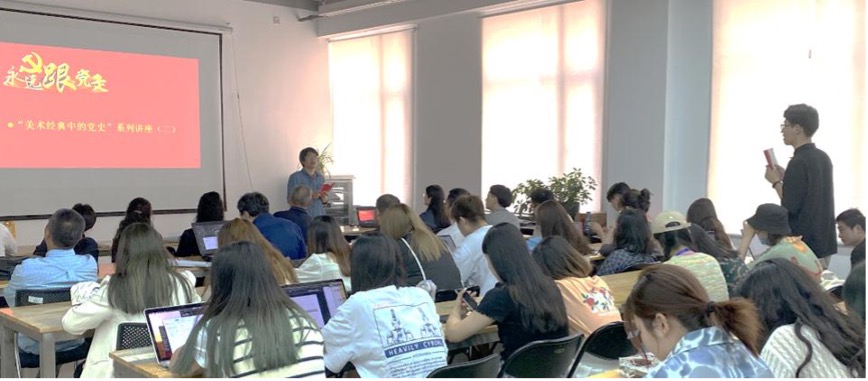 之后由教职工党支书宫万琳老师为师生们讲解“美术经典中的党史”党课,结合经典油画作品《井冈山会师》深入讲解美术作品中蕴含的党史、民族精神与时代精神。