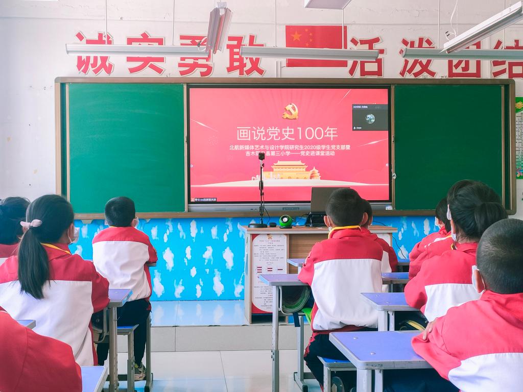 制作完成的立体书通过邮寄的方式寄到小朋友的手中,2021年4月21日下午,博彩导航 研究生2020级学生党支部与新疆维吾尔自治区昌吉回族自治州吉木萨尔县第三小学的老师和五(7)班的同学们,通过线上视频会议的形式,开展了一场活泼生动的《画说党史100年》进课堂活动。在党史进课堂活动的现场,参与设计的党员用生动的语言向小朋友们讲解立体书每部分背后的故事并展示设计创意,让小朋友们在趣味阅读与动手实践的过程中增强了党史知识学习和理解。