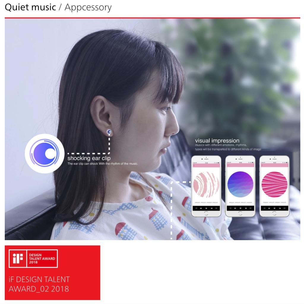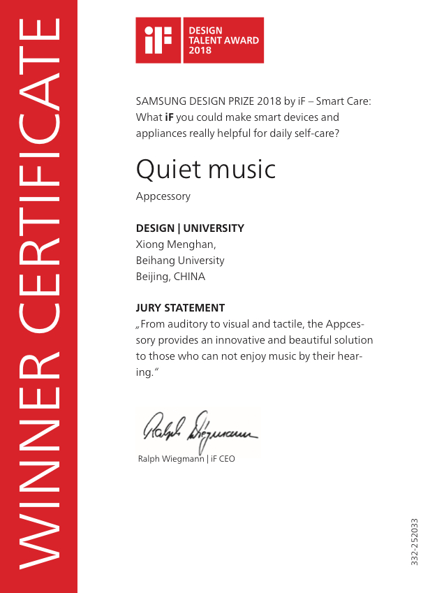 2018年iF设计新秀奖共设4个参赛主题。该作品以“智能关怀”(Smart Care)为主题进行设计,其灵感源于对听障患者的关怀,通过APP将不同类型的音乐提炼为各种色彩组合和动态图形,同时连接智能设备将音乐节奏转换为震动的触感,帮助听障人群感受音乐的节奏,情感,律动。该作品将在德国汉堡IF设计展中全年展出,并在iF design app刊登无限期展示。
