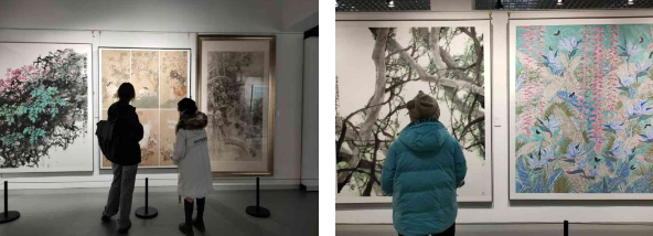 观展过程中,李佳以幽默风趣的形式讲述了画展的作品及它们背后的故事。对于突破传统的中国画作品,同学们纷纷提出关于绘画技法和画面表现形式的疑问,李佳十分耐心的为同学们解答。在观展的同时,吕卫锋也针对计算机技术与绘画,结合本次展览,与李佳和同学们深入探讨电子绘图、AI如何实现中国画风格等问题。在互动的过程中,不仅加深了同学们对绘画的理解,也为学习创造了浓厚的氛围,大家在轻松愉快的气氛中收获了知识和艺术的双重滋养。