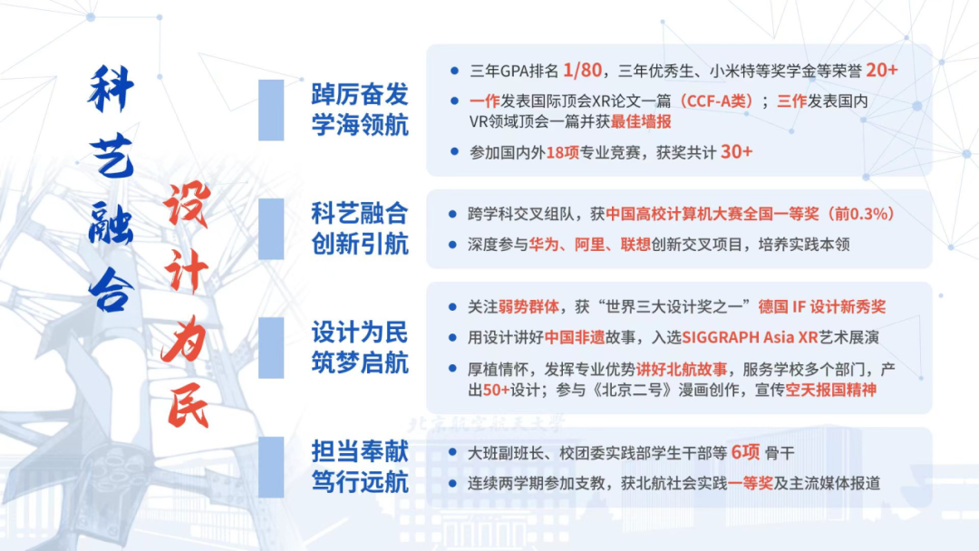 2020级本科生,中共党员,三年GPA排名1/80。一作发表国际计算机图形图像研究领域顶级会议SIGGRAPH Asia XR短文1篇(CCF-A类);三作发表国内顶级虚拟现实领域学术会议China VR论文1篇并获最佳墙报。曾获德国IF设计新秀奖(世界三大设计奖之一,前1%)、中国高校计算机大赛全国一等奖(前0.3%)、全国高校数字艺术设计大赛全国一等奖(前0.4%)、“挑战杯”金奖、小米特等奖学金(全校本科生5名)等国内外高水平设计专业竞赛和荣誉称号50+项。