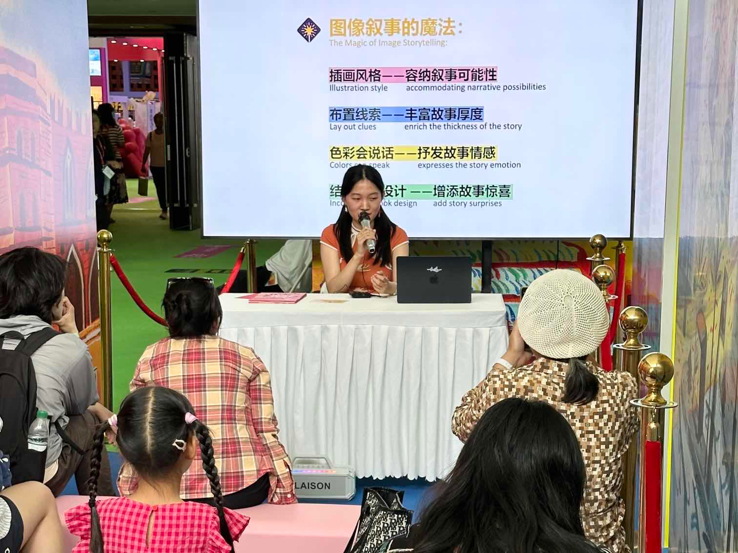 此外,董昕昱还在BIBF插画展的插画师生存角进行了以“图像叙事的魔法”为主题的《小舞狮》绘本创作分享,向观众展示了绘本创作的奥秘。同时,她还策划并主持了“嗨玩版画艺术!和小舞狮一起刻刻画画”的亲子木刻版画工作坊,为观众带来了丰富多彩的互动体验。