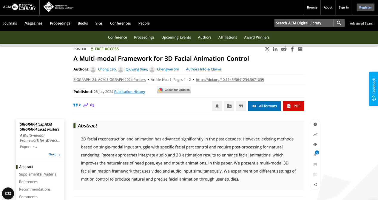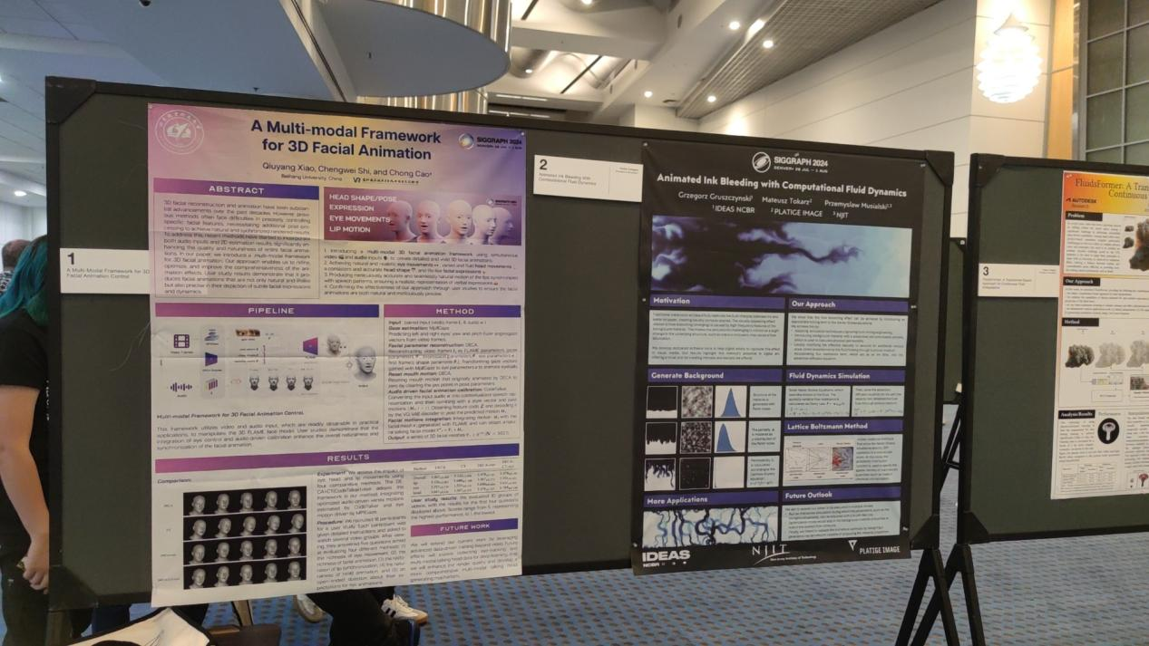 2024年7月,博彩导航 曹翀老师指导的2022级本科生石城玮和2021级本科生肖秋瑒(计算机博彩导航 )发表的科研论文“A Multi-modal Framework for 3D Facial Animation Control”(多模态三维面部动画控制机制)正式被计算机图形学顶级会议SIGGRAPH(Special Interest Group on Computer Graphics)收录,在大会上进行Poster展示,并入选SIGGRAPH 2024 Techmical Papers sesions(技术论文展示环节),标志着博彩导航 学术水平和影响力进一步提升。