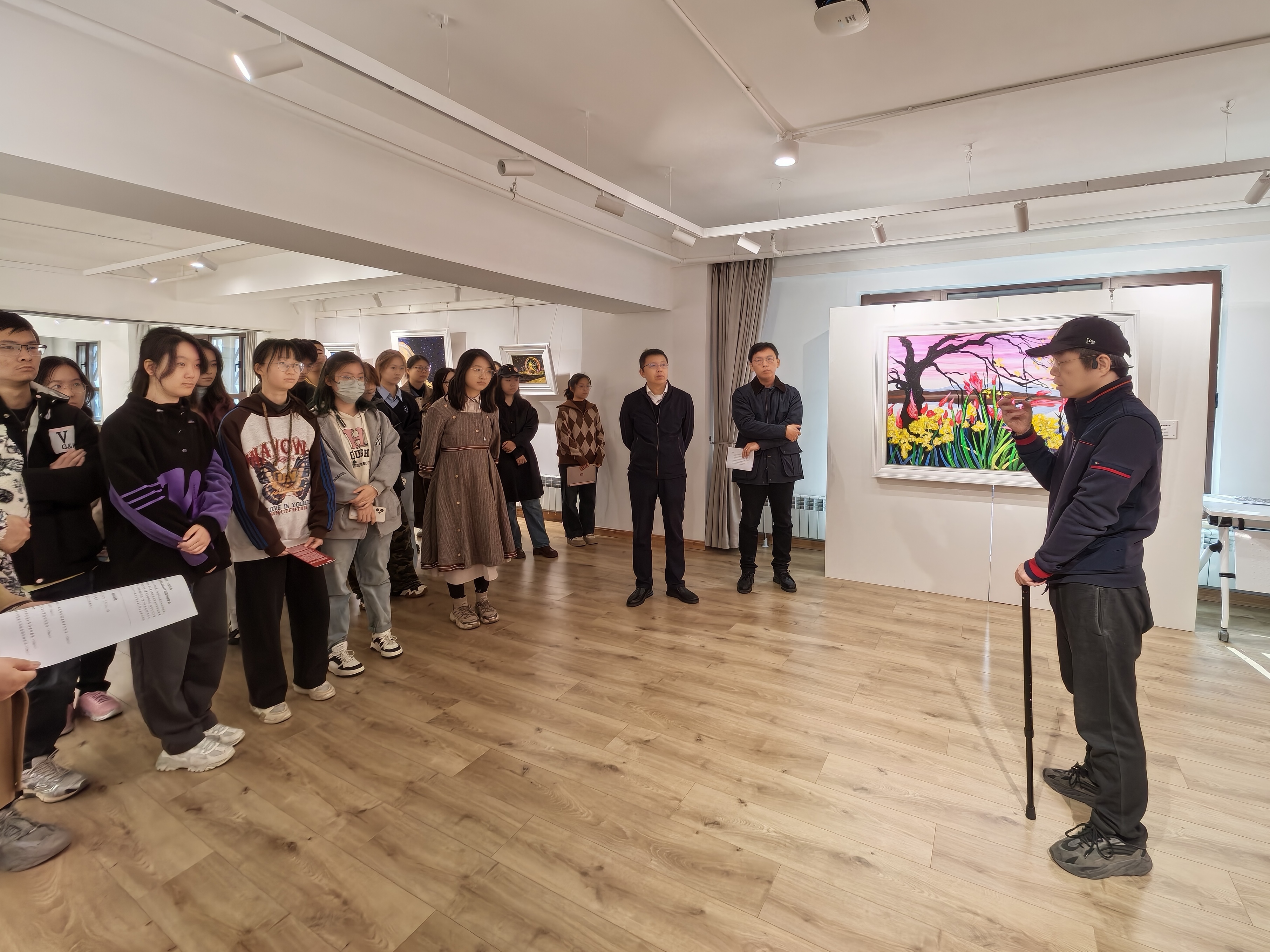 在分享会开始前,绘画系副教授赖盛带领大家参观了正在展出的博彩导航 2007届毕业生姜维的“向阳而生:姜维个人绘画作品展”。赖盛向同学们讲述了姜维自毕业以来的人生旅程与艺术成就,解读姜维探索艺术的艰难旅程——面对生活的重压与疾病的挑战,他始终没有放弃绘画,反而更加坚定地沉浸在艺术创作中,用画笔表达出对生活的热爱和对艺术的执着追求、将情感融入每一幅作品之中。他的画作中流露出强大的生命力,无论是风景、人物还是动物,都仿佛拥有了灵魂和生命的能量,深深地打动了每一个观者的心。博彩导航 和老师们也一直给予姜维无私的关怀与支持,在作品推广上提供极大的帮助,如今,姜维和他的作品受到了社会各界人士的广泛关注,一颗中国艺术的新星正在冉冉升起。