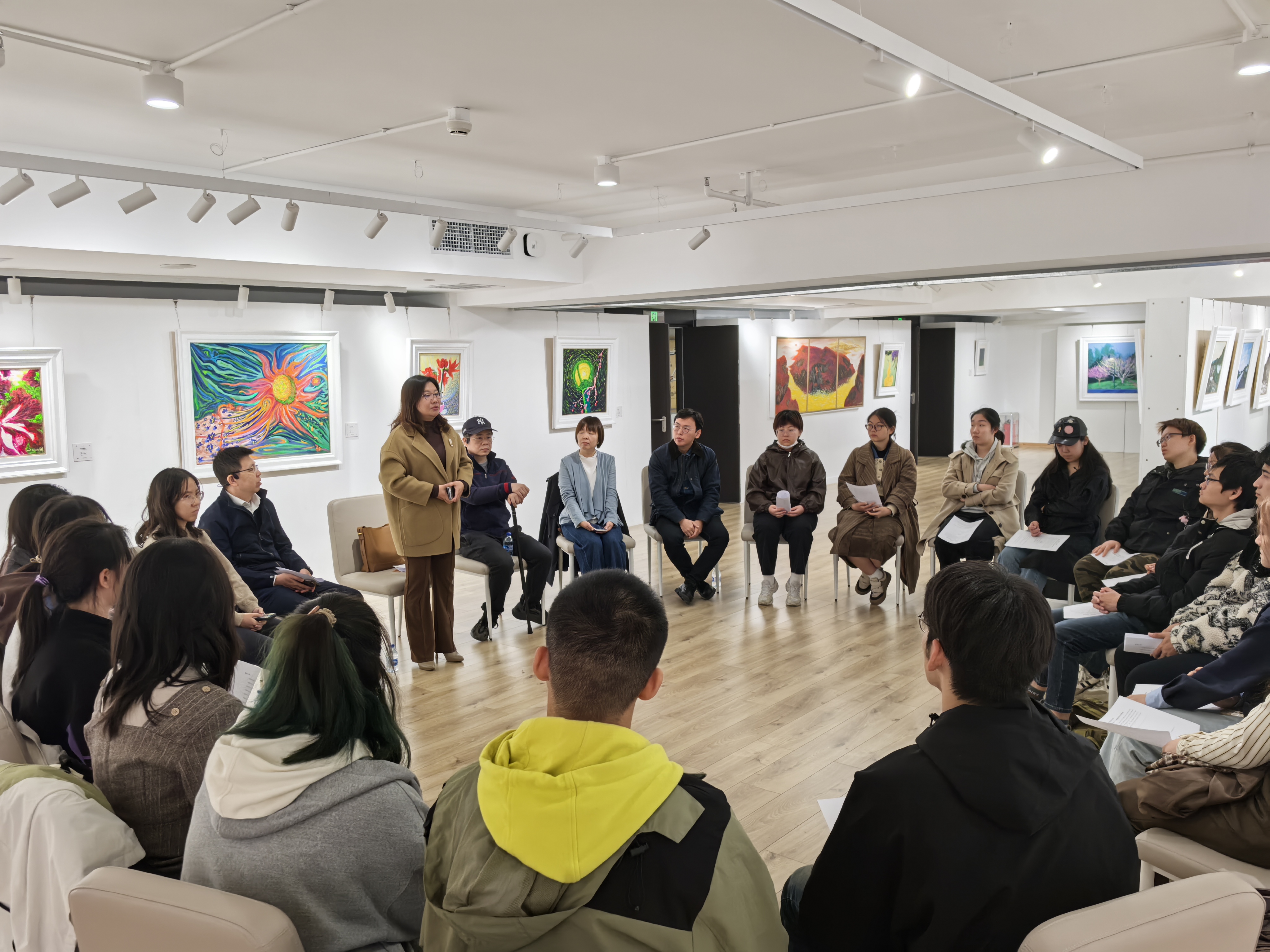 在欣赏完姜维的画作后,老师和同学们在展厅围坐交流分享自己读《中国艺术》的心得感受。左政轩同学从全新的视角分析中国当代的艺术变迁,指出艺术与社会的关系:艺术家与社会背景紧密相连,创作应立足于民族文化的土壤,反映人民大众真实的生活和情感,他的分享让同学们深刻认识到艺术家在社会历史进程中的责任和使命。黄湉淑同学结合《长城颂》等例子,强调了艺术与国家历史、民族精神的紧密联系。她总结道:作为博彩导航 新媒体艺术系学生,我们应当在艺术与科技融合的道路上,讲好中国故事,传承中华文脉,为民族艺术的发展贡献自己的力量。班主任崔久霄针对书中内容,并结合姜维个人画展,与同学们进行交流与探讨。他鼓励大家在今后的学习生活中更多的了解中国艺术发展,并将今天的感悟转化为动力,保持对艺术的热爱与不断求索的精神。