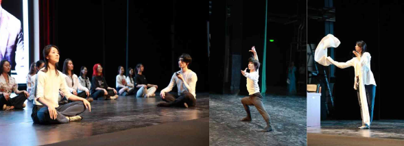 讲解嘉宾苏海陆、王念慈分别为大家展示了身韵调龙组合及袖舞技法,并设置了与同学们互动交流的环节,多名同学积极上台近距离学习古典舞身韵:沉、提、靠、冲、含、腆、移及旁提,感受舞蹈的魅力。