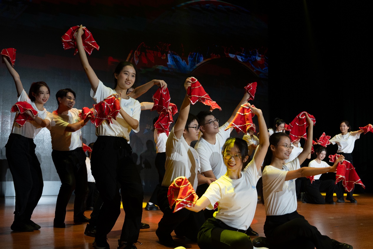 音乐会开场舞是张璇老师开设的《中国民间舞蹈审美实践》课程教学展示群舞《东方红民族韵律操》,该舞蹈由汉族、藏族、佤族、傣族、蒙古族、维吾尔族、彝族、苗族八节组成,让同学们在感受民族文化的同时,提升文化自信心与包容感。