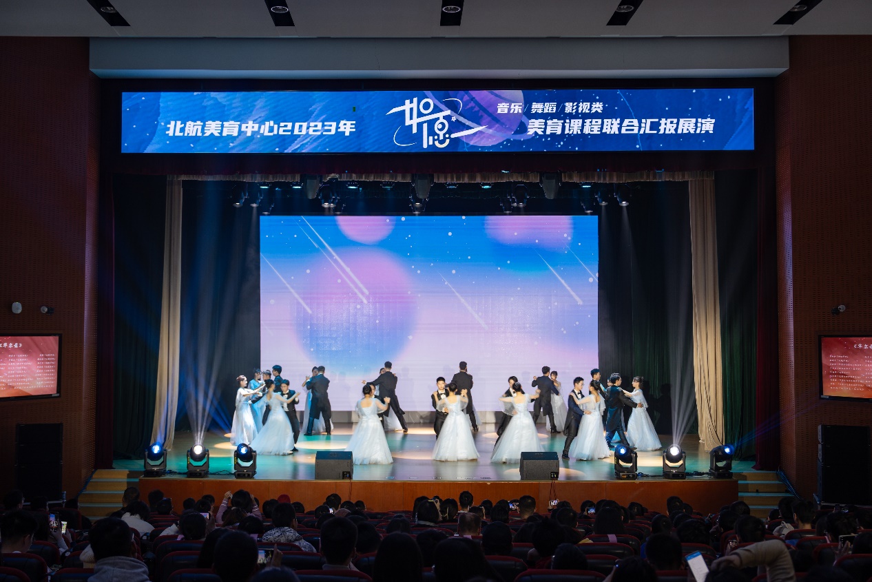 本次美育课程联合汇报展演的影像和美术设计分别由邹玲老师的课程《几何造型与数字舞台表演》、张弛老师的课程《海报创意与制作》承担制作。现场近500名观众观看了演出。